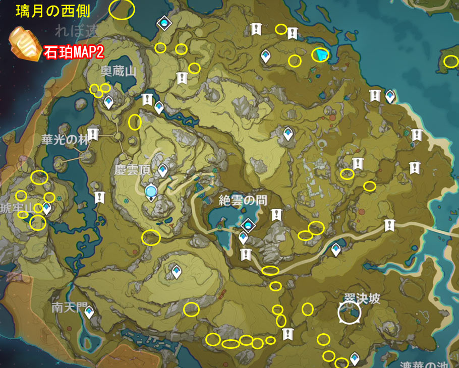 ※MAP追加しました「「石珀」がある璃月の西側・奥蔵山・琥牢山・絶雲の間周辺MAP(170KBあります)」(公式mapツールへのリンクはこちら「石珀」)