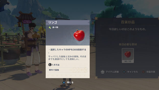 「りんご」は、モンド城の東にある「囁きの森」の木に2か所実ってます。ほかヒルチャール近くのタルや木箱。NPC「リン」近く。モンドの望風山地のワープポイント西や北の木にも。 - 10月29日