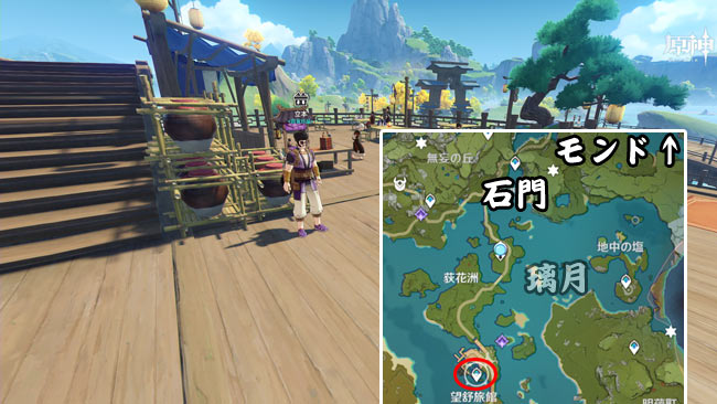 場所は璃月MAP中央付近の町。モンド城から遥か南西方向、昨日の石門の場所より、南に位置しています。商人は、望舒旅館の大きな建物の入口階段前(1階)人々が集まる露店前にいます。