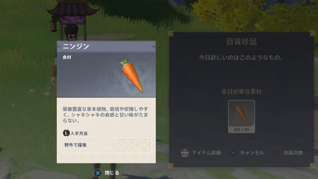 「ニンジン」の入手場所は、一番近いのは、七天神像ワープポイントの西側の地面に4本ほどあり。そのほか「清泉町」の各キラキラしている箱を調べるなどで出現。