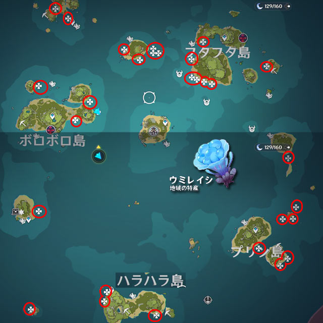 (突破に必要になる「ウミレイシ」は、特定海域や島「金リンゴ群島」(期間限定イベントMAP)などで入手できる。プリン島の浜辺、ハラハラ島南東の浜辺、ボロボロ島の南の浜、ボロボロ島北の島の浜辺などで拾える。(下:MAP「金リンゴ群島」画像追加しました。)
