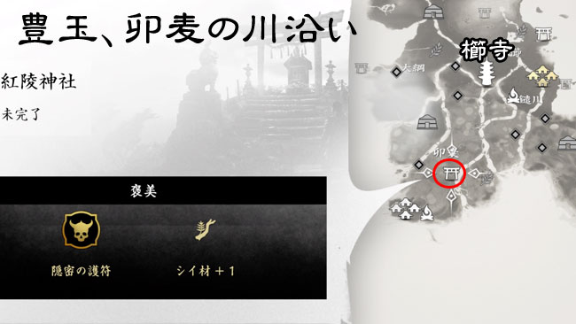- 神社の頂上にある社にお参りすることで、金色の護符、弓の強化素材「シイ材」が貰える。
