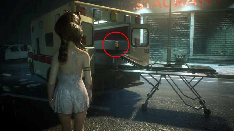 - 2つめ:大通りに止まっている後部が開いた救急車内に人形。